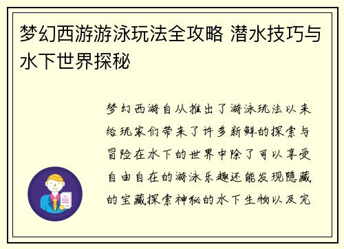 梦幻西游游泳玩法全攻略 潜水技巧与水下世界探秘
