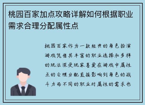 桃园百家加点攻略详解如何根据职业需求合理分配属性点