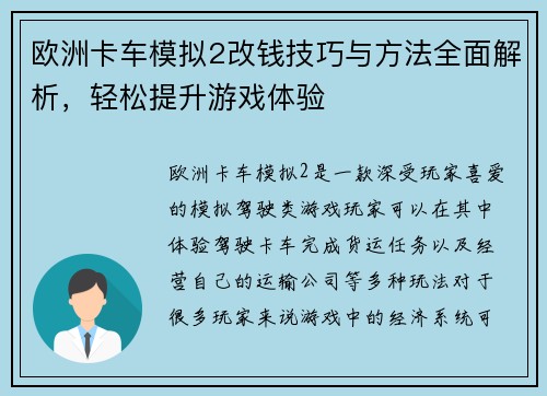 欧洲卡车模拟2改钱技巧与方法全面解析,轻松提升游戏体验